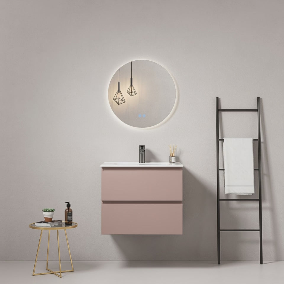 Mobile bagno sospeso 60 cm Rosa Retro Lavabo in Ceramica Specchio Tondo Retroilluminato - Fiji Paint
