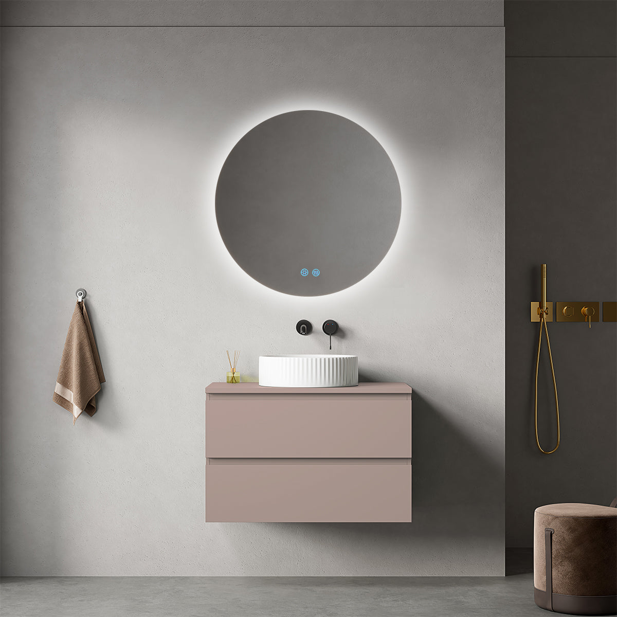 Mobile bagno sospeso 80 cm Rosa Retrò per Lavabo d'appoggio Specchio Tondo Retroilluminato - Fiji Paint Top