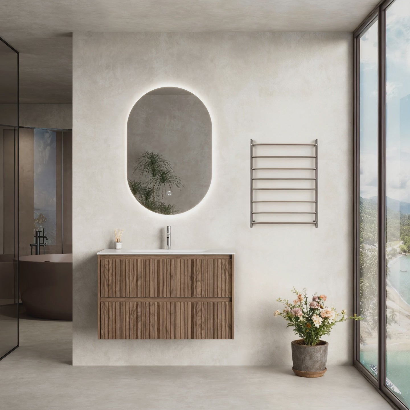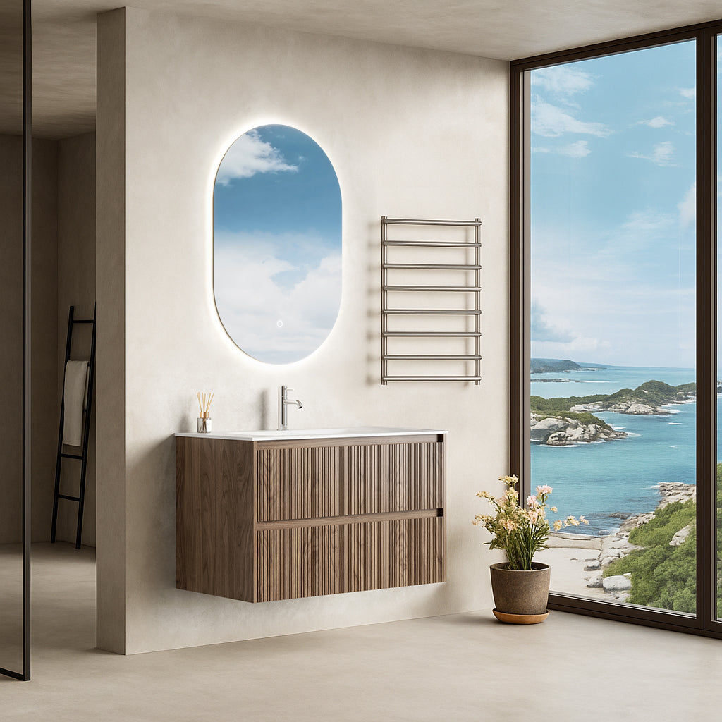 Mobile Bagno Sospeso 90 cm Rovere Scuro Specchio Ovale Retroilluminato - Pace Plus