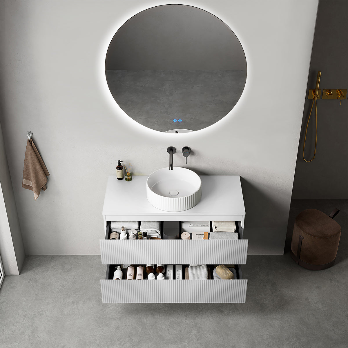 Mobile bagno sospeso cannettato 100 cm Bianco Opaco per Lavabo d'appoggio Specchio Tondo Retroilluminato - Fiji Paint Top Canneté