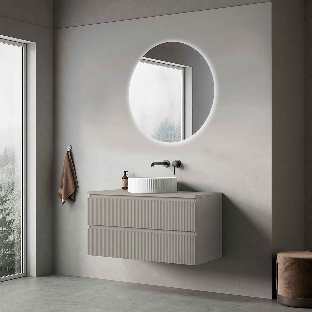 Mobile bagno sospeso cannettato 100 cm Grigio Cenere per Lavabo d'appoggio Specchio Tondo Retroilluminato - Fiji Paint Top Canneté