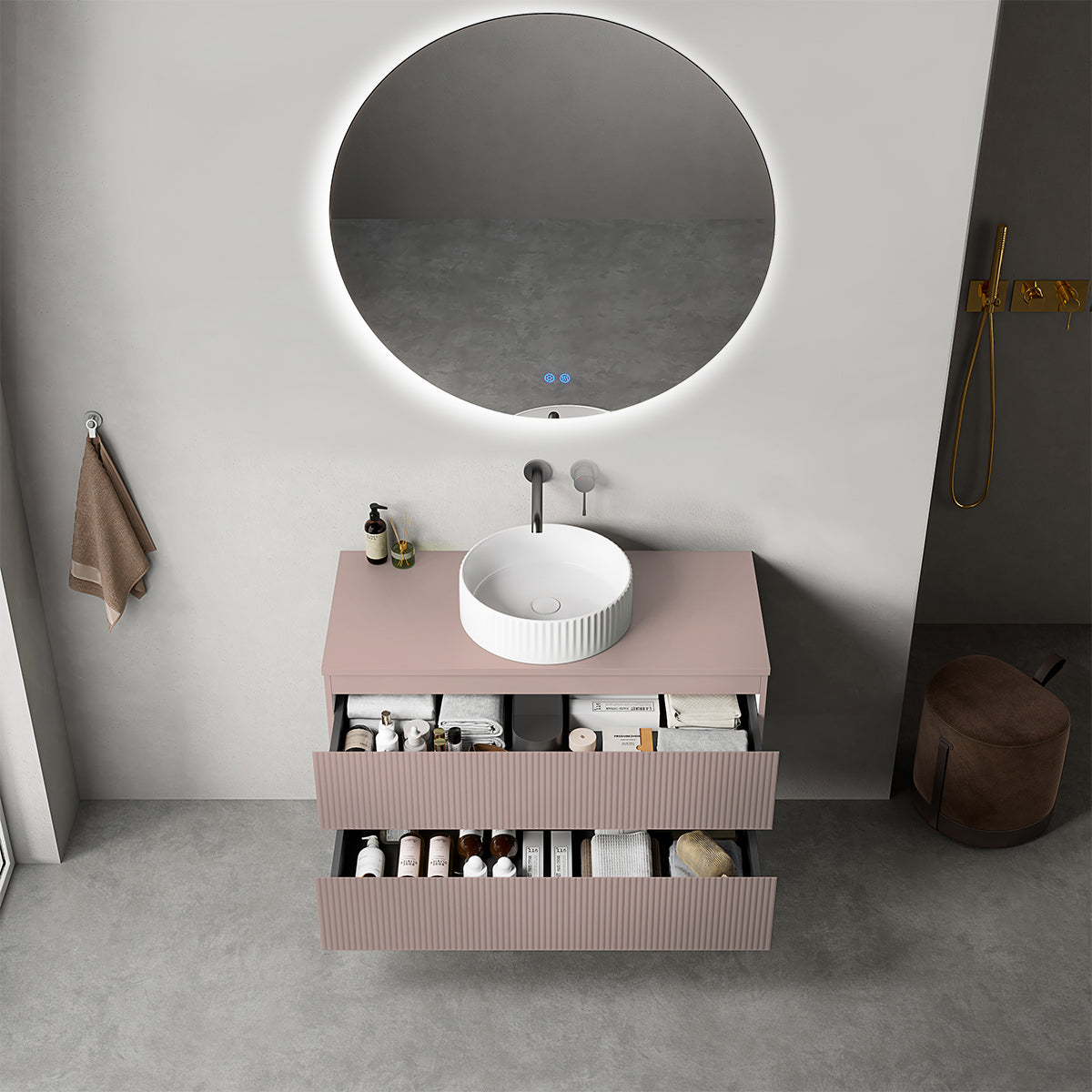 Mobile bagno sospeso cannettato 100 cm Rosa Retrò per Lavabo d'appoggio Specchio Tondo Retroilluminato - Fiji Paint Top Canneté