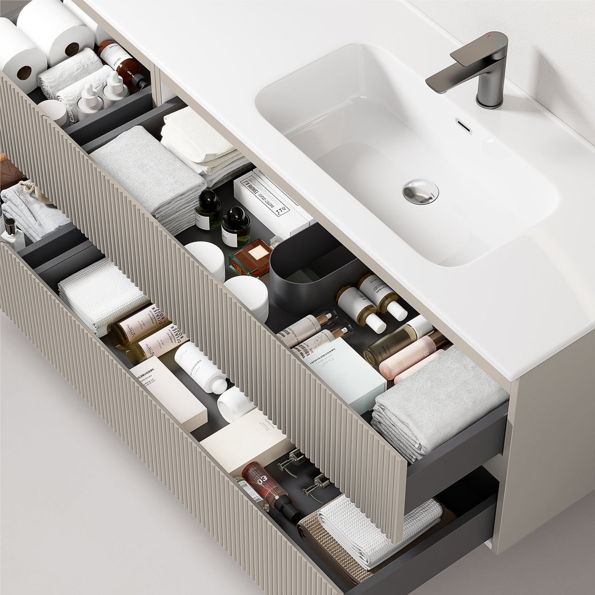 Ogni colorazione del mobile Fiji può essere abbinata a una semicolonna coordinata, ampliando così le possibilità di stoccaggio e mantenendo l'armonia estetica del tuo bagno. La semicolonna è ideale per riporre asciugamani, prodotti di bellezza e altri accessori, mantenendo tutto a portata di mano e ben organizzato.