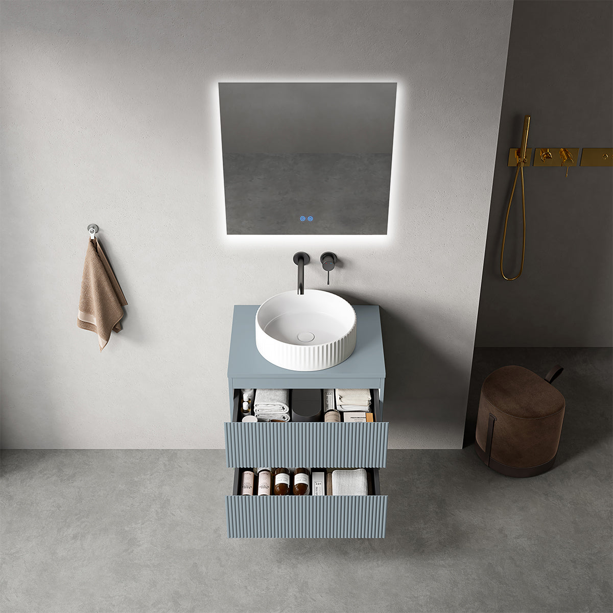 Mobile bagno sospeso cannettato 60 cm Blu Avio per Lavabo d'appoggio Specchio Quadro Retroilluminato - Fiji Paint Top Canneté
