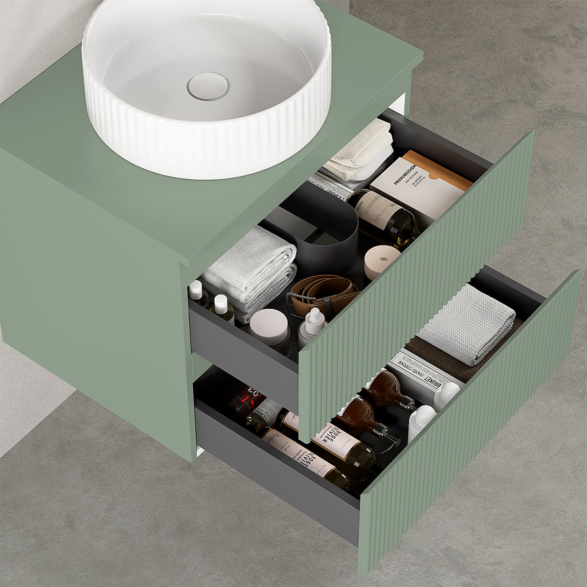 Mobile bagno sospeso cannettato 60 cm Verde Salvia per Lavabo d'appoggio Specchio Tondo Retroilluminato - Fiji Paint Top Canneté