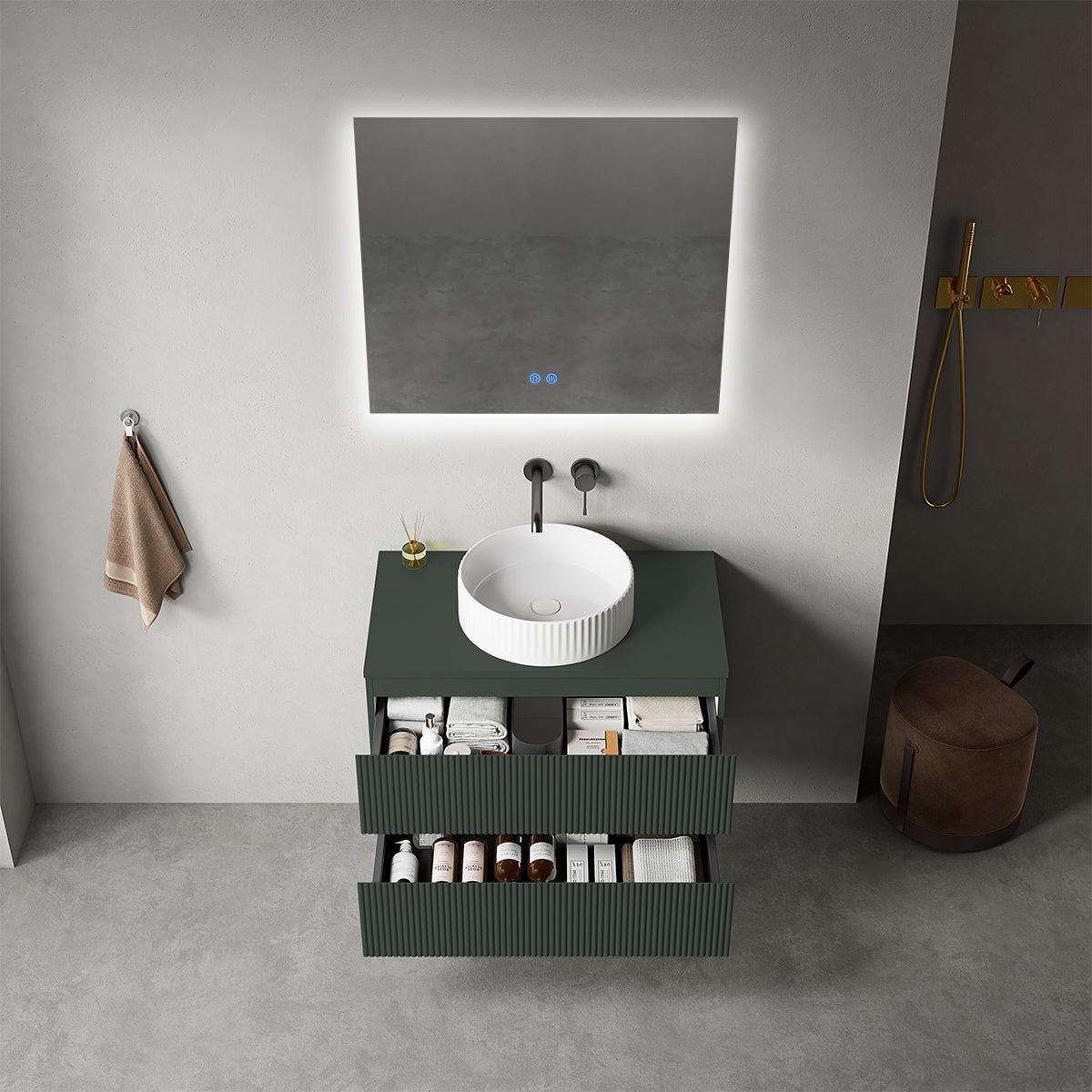 Mobile bagno sospeso cannettato 80 cm Verde Comodoro per Lavabo d'appoggio Specchio Quadro Retroilluminato - Fiji Paint Top Canneté