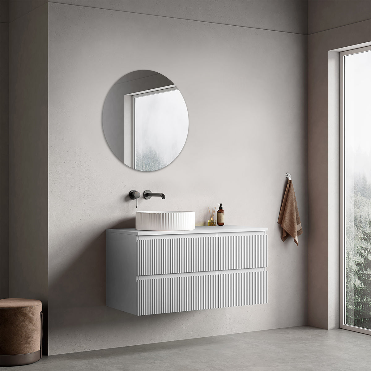Mobile bagno sospeso cannettato reversibile 100 cm Bianco Opaco per Lavabo d'appoggio Specchio Tondo - Fiji Paint Top Canneté