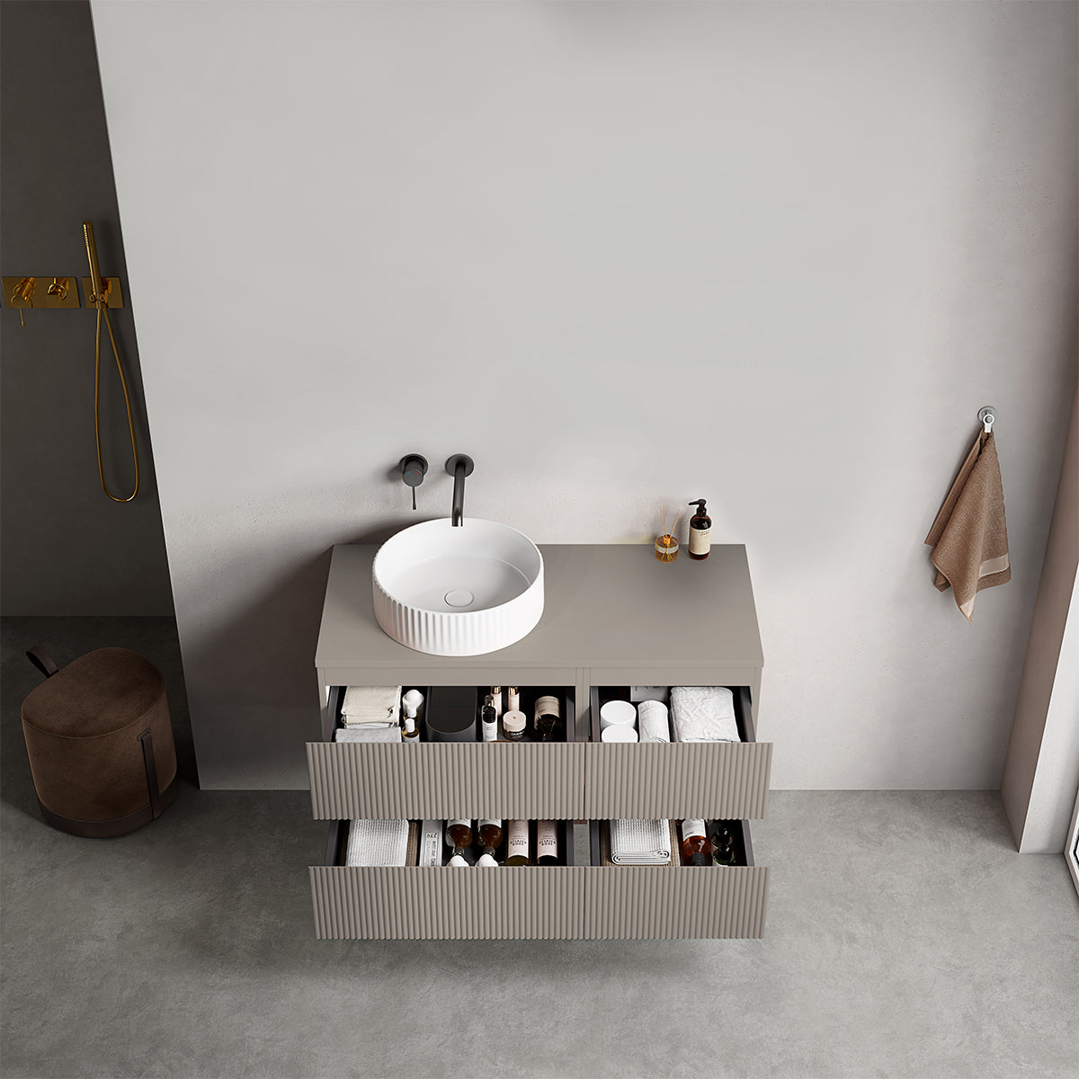 Ogni colorazione del mobile Fiji può essere abbinata a una semicolonna coordinata, ampliando così le possibilità di stoccaggio e mantenendo l'armonia estetica del tuo bagno. La semicolonna è ideale per riporre asciugamani, prodotti di bellezza e altri accessori, mantenendo tutto a portata di mano e ben organizzato.