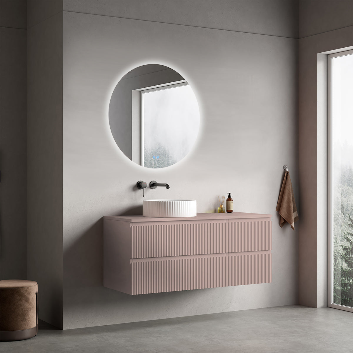 Mobile bagno sospeso cannettato reversibile 120 cm Rosa Retrò per Lavabo d'appoggio Specchio Tondo Retroilluminato - Fiji Paint Top Canneté