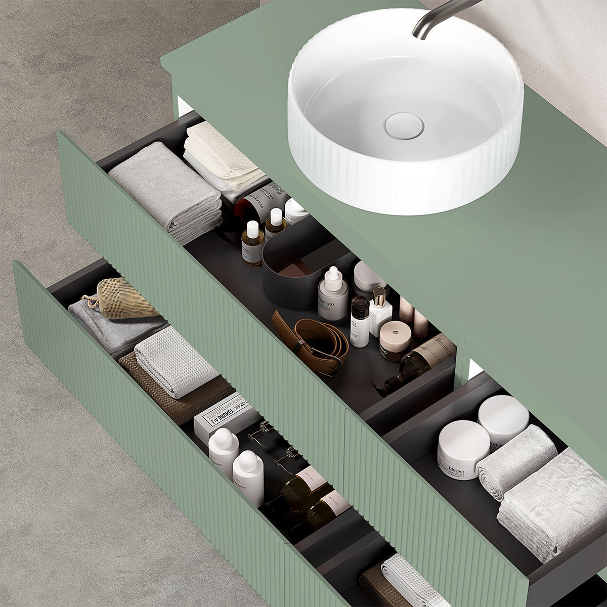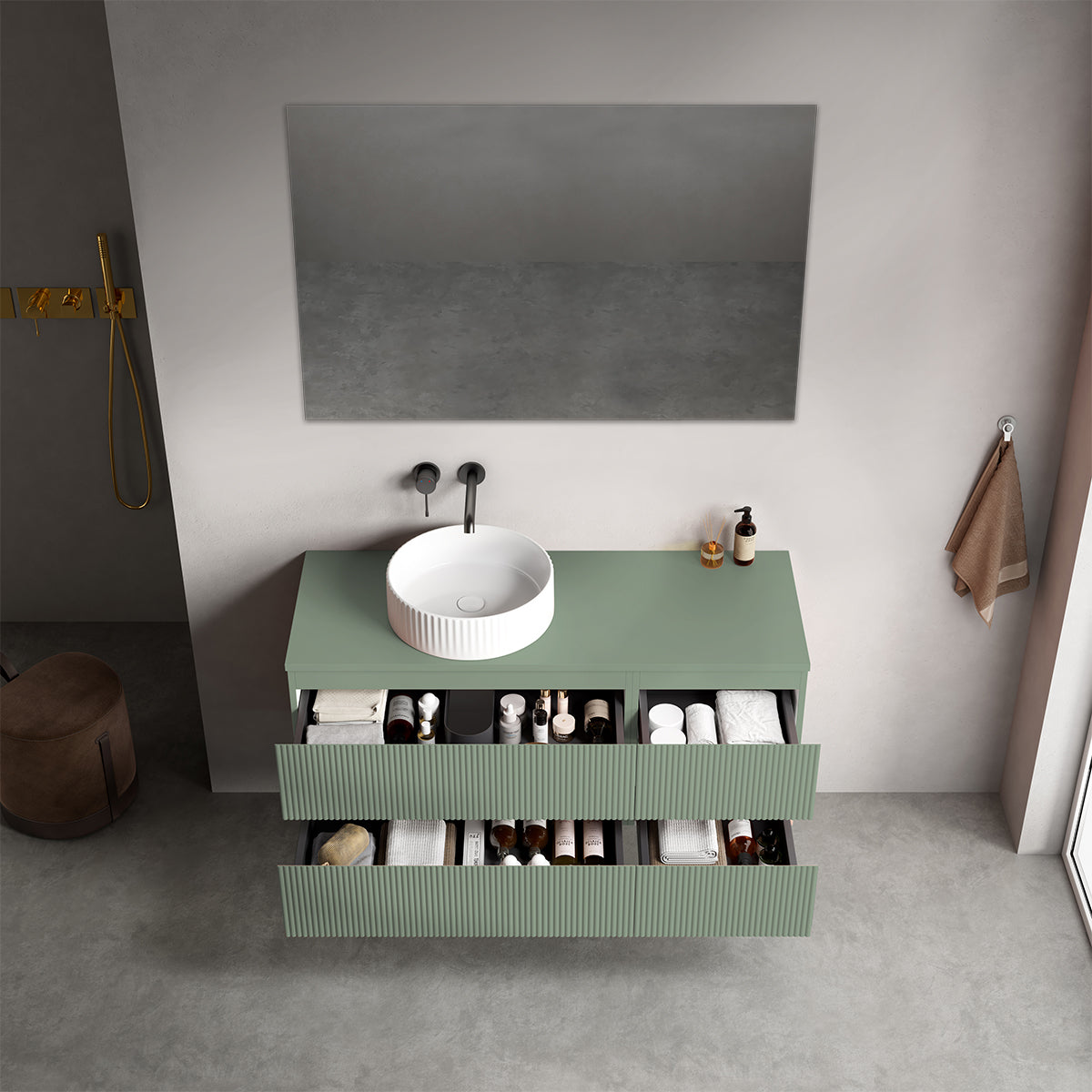 Mobile bagno sospeso cannettato reversibile 120 cm Verde Salvia per Lavabo d'appoggio Specchio Quadro - Fiji Paint Top Canneté