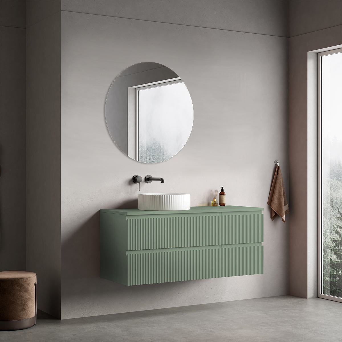 Mobile bagno sospeso cannettato reversibile 120 cm Verde Salvia per Lavabo d'appoggio Specchio Tondo - Fiji Paint Top Canneté