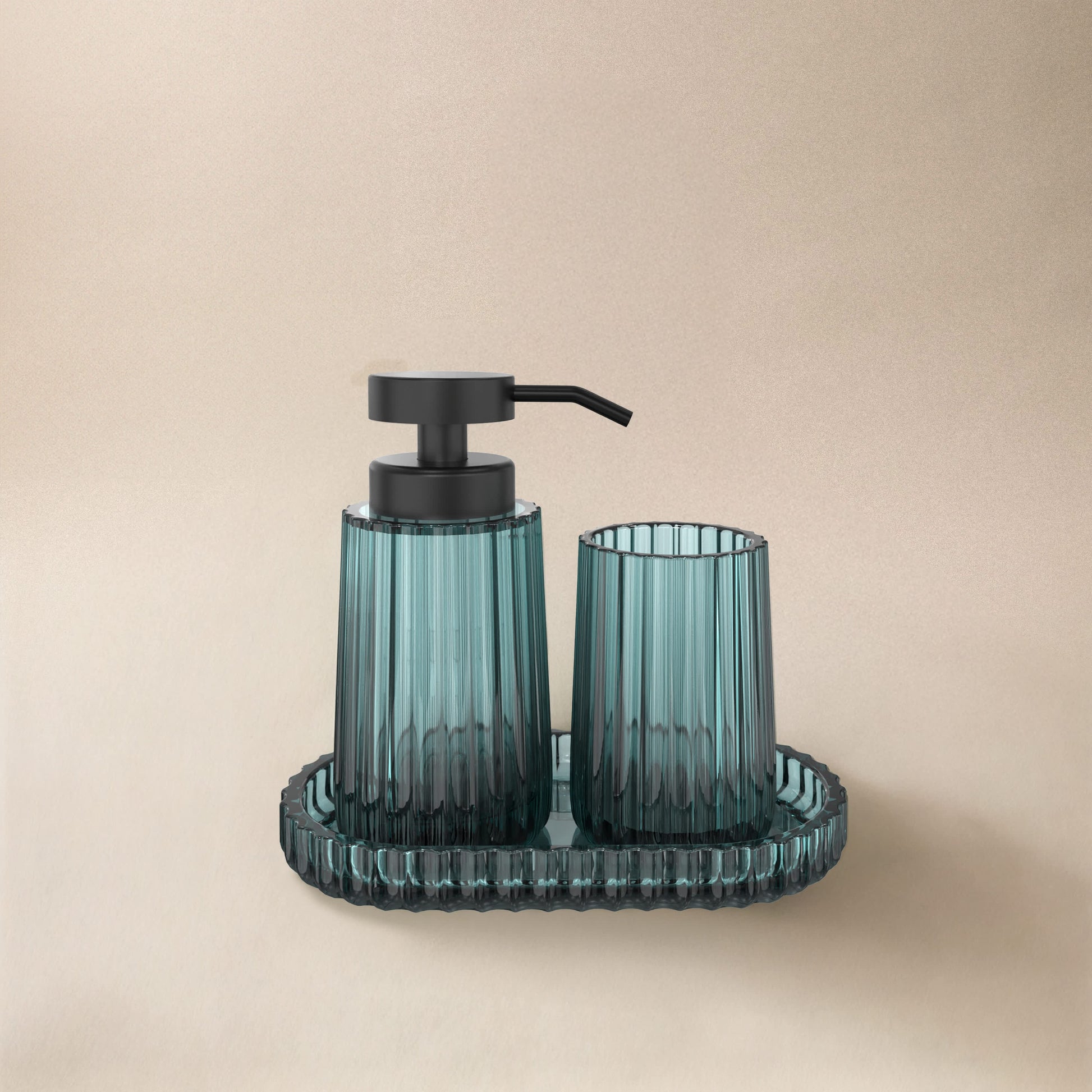 Set completo di accessori bagno in vetro fumé che combina funzionalità e design contemporaneo. Comprende porta sapone, porta spazzolino e dispenser per sapone liquido, realizzati con finiture Bluish Green che si adattano a qualsiasi stile di arredamento. Materiali di qualità garantiscono durabilità e facilità di pulizia. Ideale per chi ricerca soluzioni organizzate e eleganti per il bagno, mantenendo un'estetica minimalista e sofisticata.